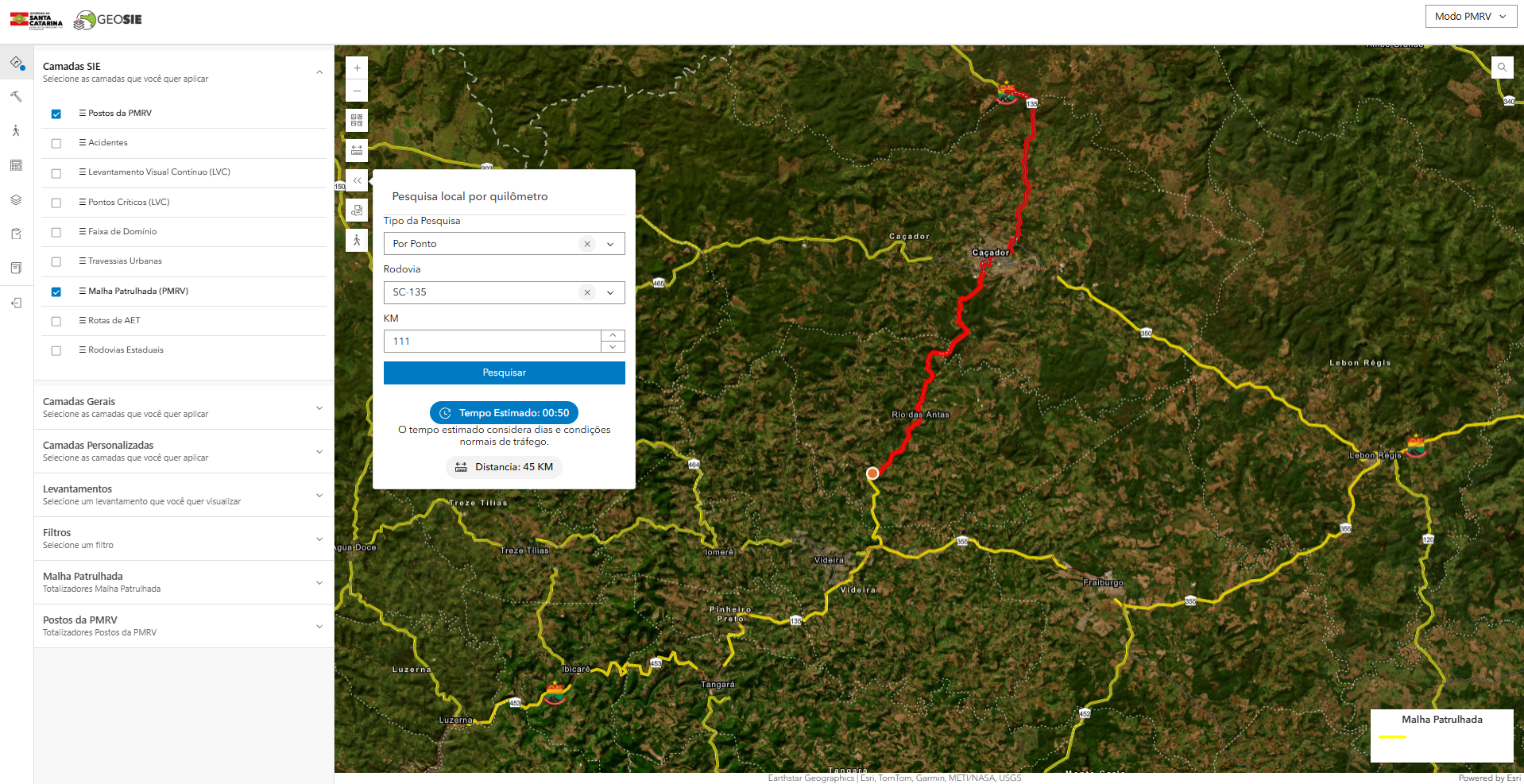 - A camada “Malha Patrulhada (PMRV)” é acionada;